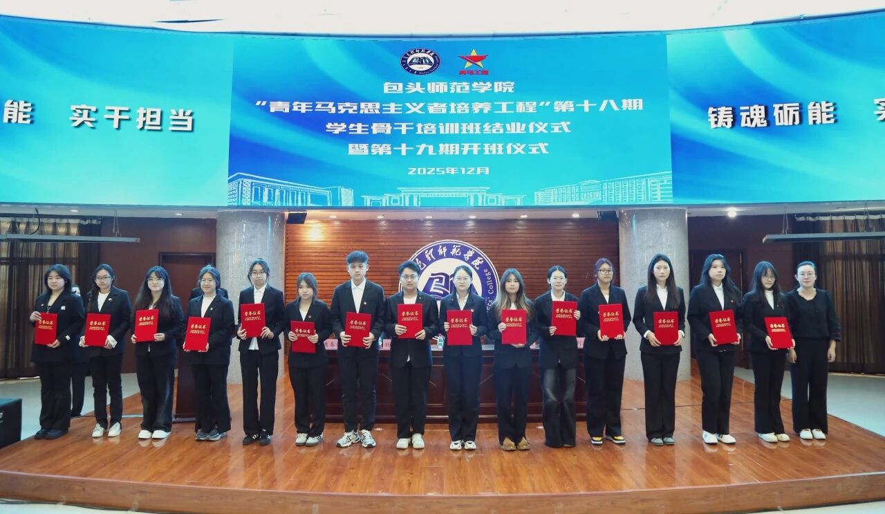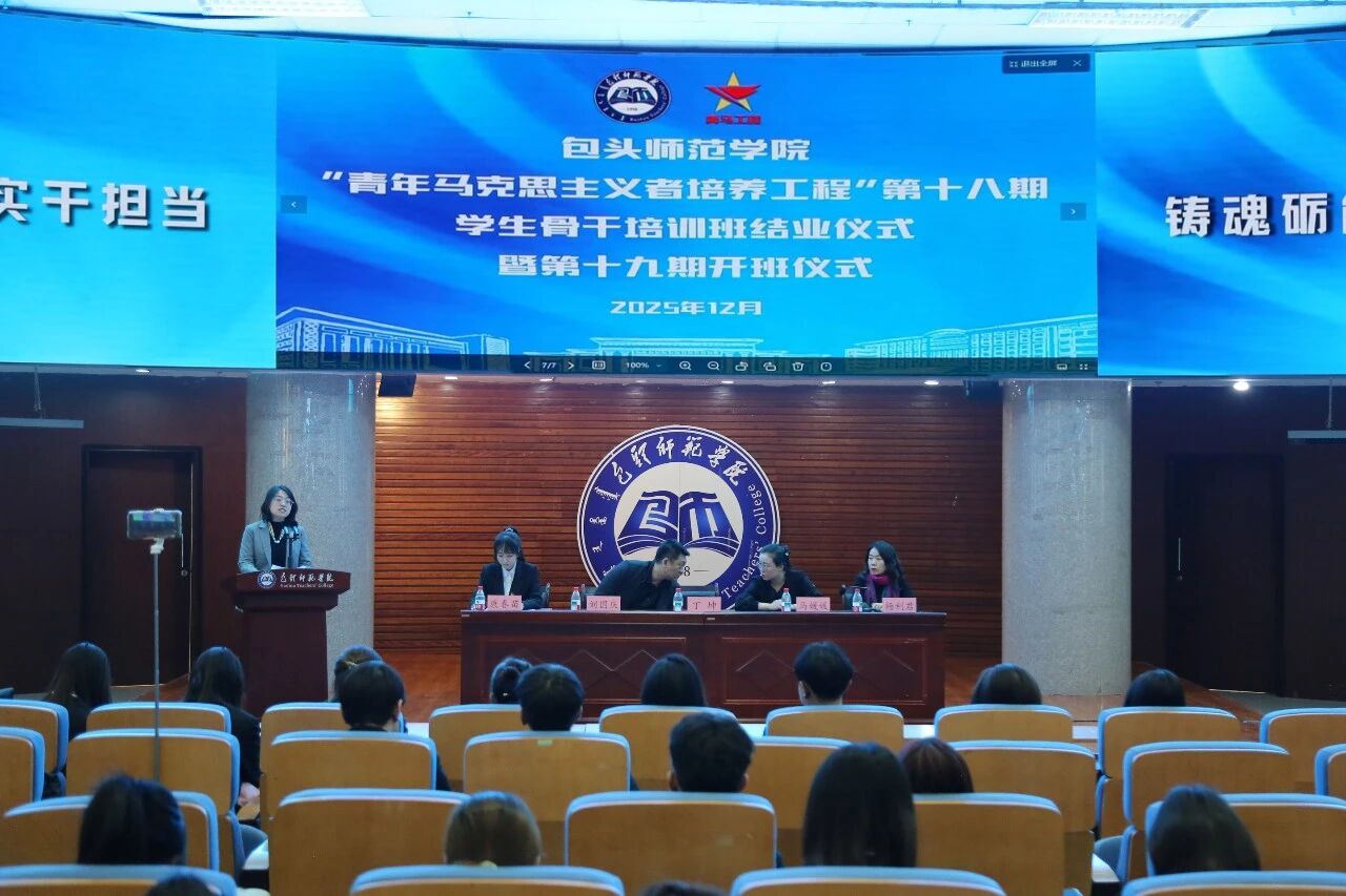 为深入学习贯彻习近平新时代中国特色社会主义思想,贯彻落实习近平总书记关于青年工作的重要思想,扎实推进青年马克思主义者培养工程科学化、规范化建设,着力为党培养和输送一批具有忠诚政治品格、浓厚家国情怀、扎实理论功底、突出能力素质的青年政治骨干,筑牢广大青年紧跟党走中国特色社会主义道路的信仰之基,12月4日下午,我校在博学楼学术报告厅举行第十八期“青年马克思主义者培养工程”学生骨干培训班结业仪式暨第十九期开班仪式。校党委宣传部、学生工作部、团委等领导、各学院党总支副书记、团总支书记,以及第十九期全体学员与第十八期结业学员共同参加活动。