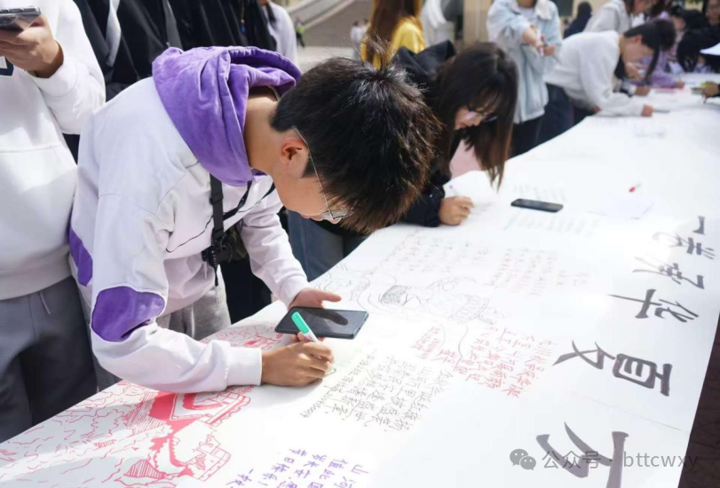 神州大地,万里恒昌。伴随着渐浓的秋意,我们即将迎来祖国母亲第七十六个生辰。在祖国生日来临之际,文学院于9月25日下午三点在北苑学子广场举办了“一卷承华夏,万心贺九州”锦绣长卷活动。通过题诗与作画等多种方式将师院学子对祖国的赤诚热爱与美好期许倾注于画卷之上。