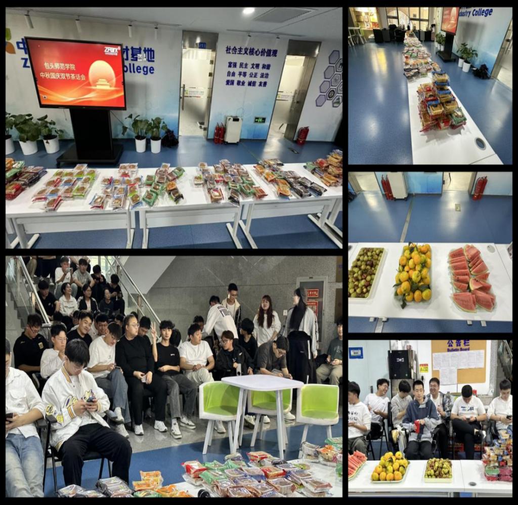 茶话会现场布置充满节日气息,桌上整齐摆放着月饼、新鲜水果与各类特色茶点,香甜气息与喜庆装饰交织,处处洋溢着中秋与国庆双节的热闹氛围。活动环节丰富多元,既有 “歌声嘹亮” 环节,学子们以嘹亮歌声传递对祖国的祝福;又有幽默诙谐的特色节目,引得现场笑声不断,大家将对祖国的赤诚与对中秋的团圆期盼融入作品,精彩表现让现场不时响起阵阵热烈掌声。