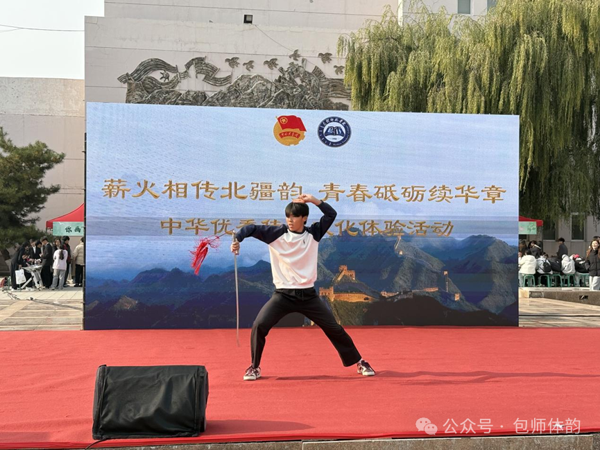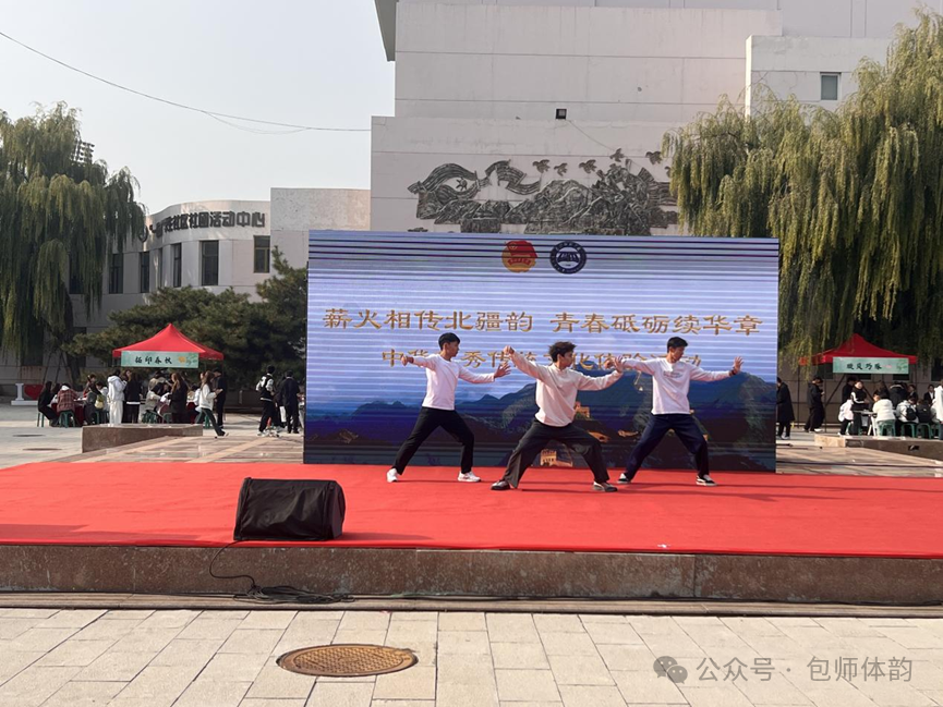 为积极响应包头师范学院团委“薪火相传北疆韵,青春砥砺续华章”中华优秀传统文化体验活动号召,体育学院以“绿茵北疆韵,运动承瑰宝”为主题,创新推出“表演+体验”的活动形式,将体育精神与北疆文化、传统技艺深度融合,为学校文化传承注入了独特的体育力量。