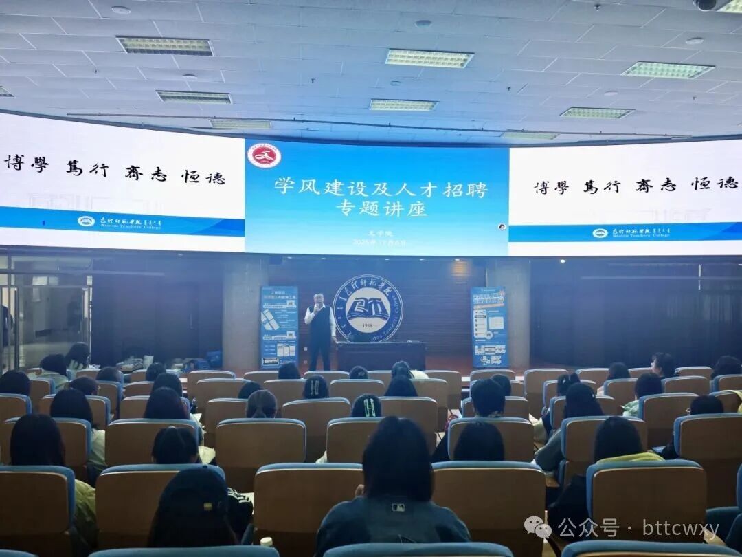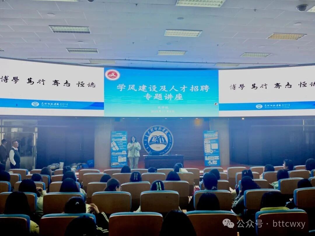 为进一步强化文学院学风建设,助力文学院学子明晰考公考研方向、科学规划学业发展,11月6日,文学院于学术报告厅成功举办学风建设及人才招聘专题讲座。讲座由学工办负责人贺芬主持,文学院党总支书记赵洪宝、马克思主义学院张雪瑞教授及新途径王成老师受邀出席并作专题分享。