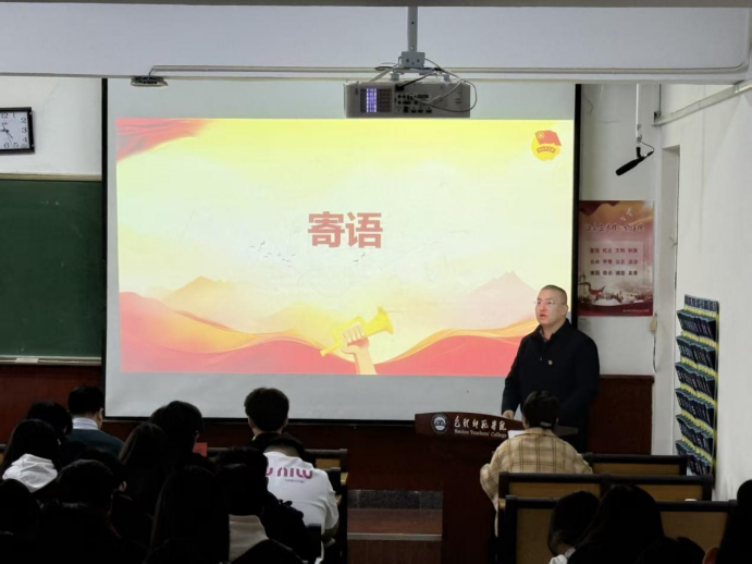 学院党总支副书记杨志威向新团员表示祝贺,他强调加入中国共产主义青年团既是荣誉更是责任,提出殷切期望:一要筑牢信仰之基,深入学习贯彻习近平新时代中国特色社会主义思想;二要练就过硬本领,在新能源材料、绿色化学等前沿领域深耕细作;三要勇担时代重任,将个人理想融入国家"双碳"战略,为建设科技强国贡献青春力量!