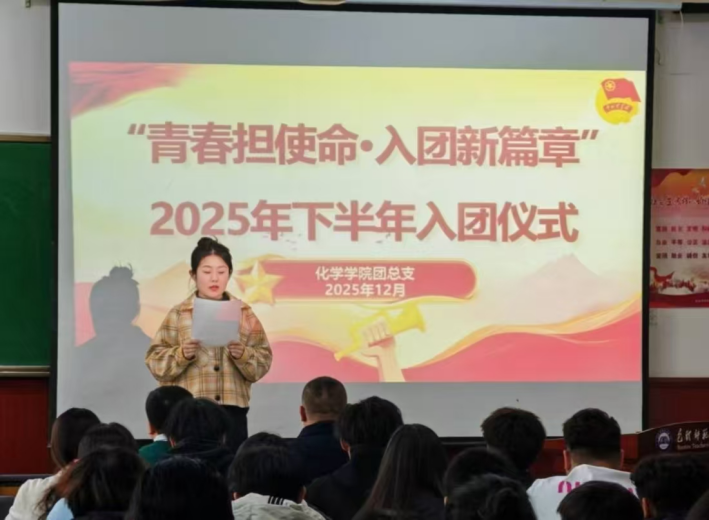 为深入学习贯彻党的二十大精神,加强共青团组织建设,12月5日下午,化学学院在齐志楼329教室隆重举行2025年下半年新团员入团仪式。化学学院党总支副书记杨志威、化学与能源化学学生党支部书记徐向明、团总支负责人李丽出席仪式,与新发展的130名团员共同见证这一光荣时刻。