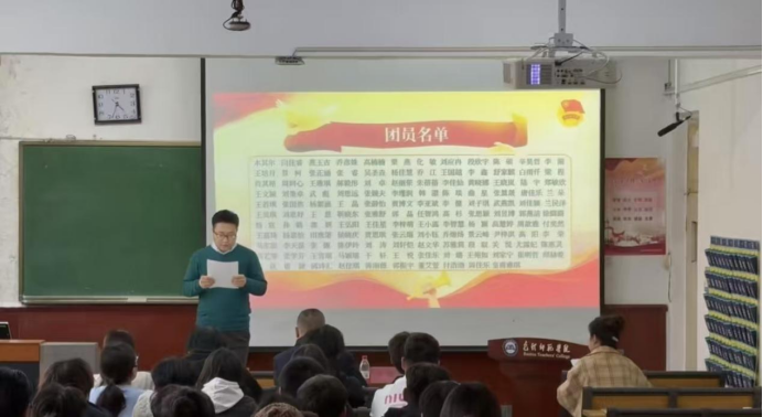 仪式在庄严的国歌声中拉开序幕,徐向明老师郑重宣读了新发展团员名单,130名优秀的青年学子经过严格考核,光荣加入中国共产主义青年团。在热烈的掌声中,老团员代表为新团员佩戴上熠熠生辉的团徽,颁发团员证,这枚承载着光荣与使命的徽章,象征着共青团精神的接续传承。在优秀团员代表刘煜的带领下,全体新团员面向团旗庄严宣誓,铿锵有力的誓言展现了新时代青年的坚定信念。