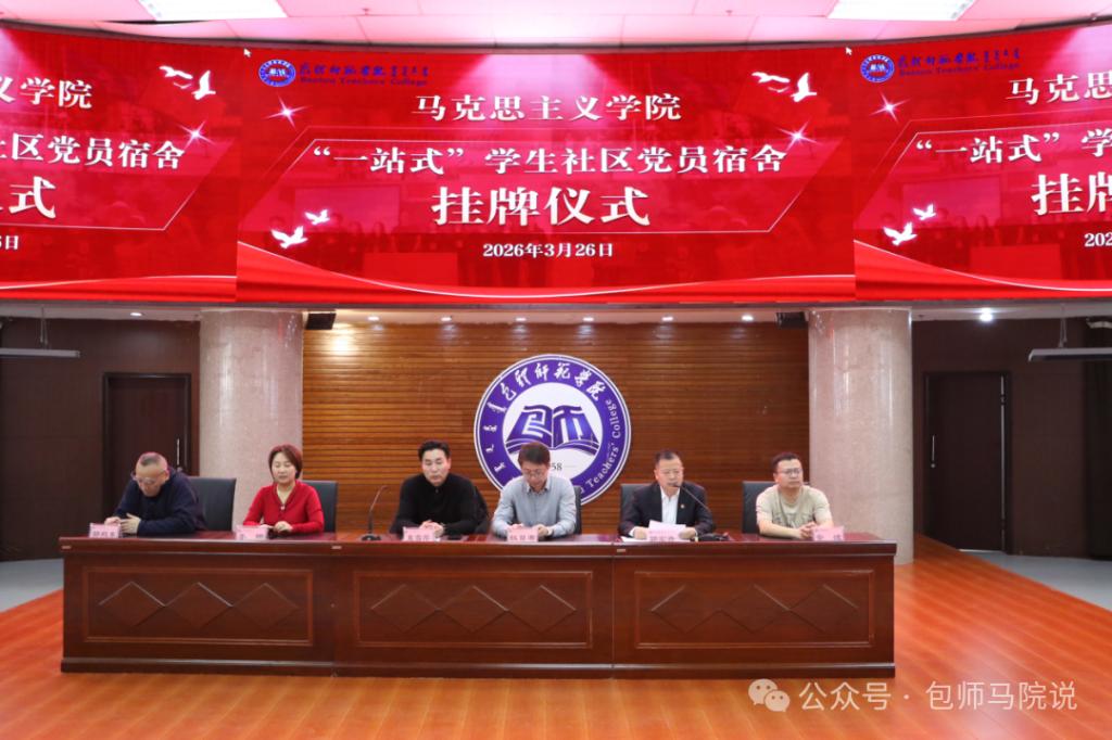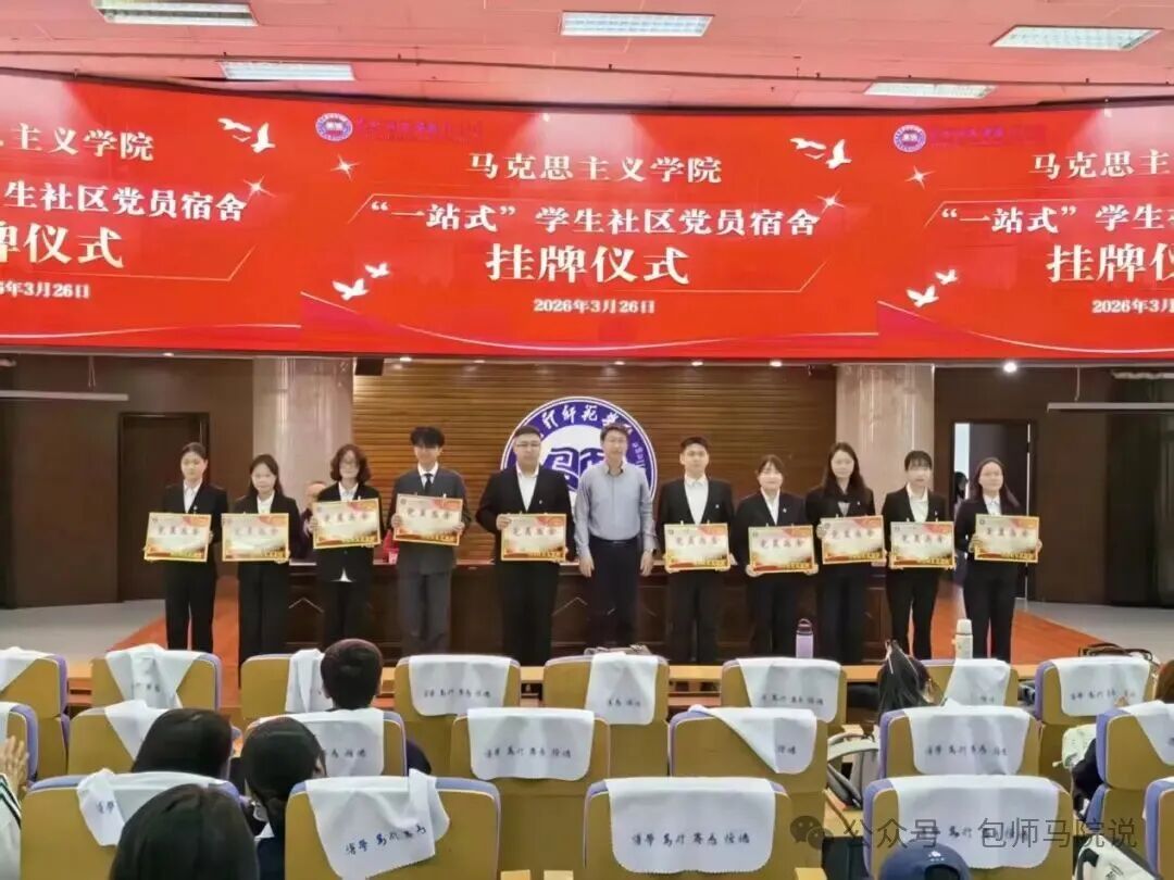 为深入学习贯彻习近平新时代中国特色社会主义思想,扎实推进“一站式”学生社区建设,充分发挥学生党员先锋模范作用,让党建力量延伸至宿舍一线,2026年3月26日下午,马克思主义学院在博学楼学术报告厅隆重举行“一站式”学生社区党员宿舍挂牌仪式。包头师范学院学生工作部副部长夏雪芹、马克思主义学院党总支书记敖日布、教工党支部书记郭殿东、学生党支部书记安波、思想政治教育系主任李娜及全体班主任、辅导员,研究生、本科生、预科生参加了仪式。仪式由马克思主义学院党总支副书记郭宏升主持。