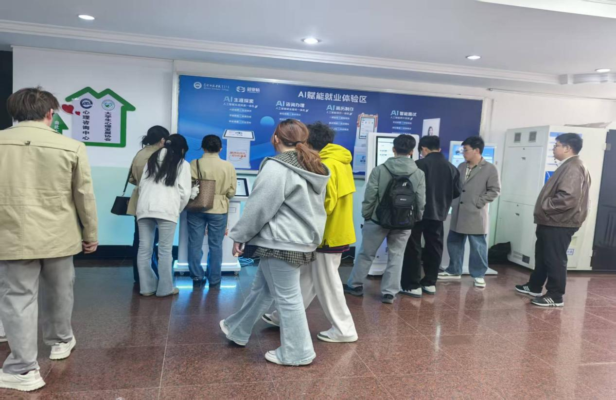 招聘会同时,由中国教育在线就业桥平台提供设备,设置了AI赋能就业体验区,主要设备包括人工智能生涯探索一体机、人工智能就业服务一体机、人工智能简历一体机、人工智能面试一体机,让参加应聘的毕业生和我校非毕业班学生提前了解、体验AI赋能就业高科技产品,为推广数字化就业服务新模式奠定基础。